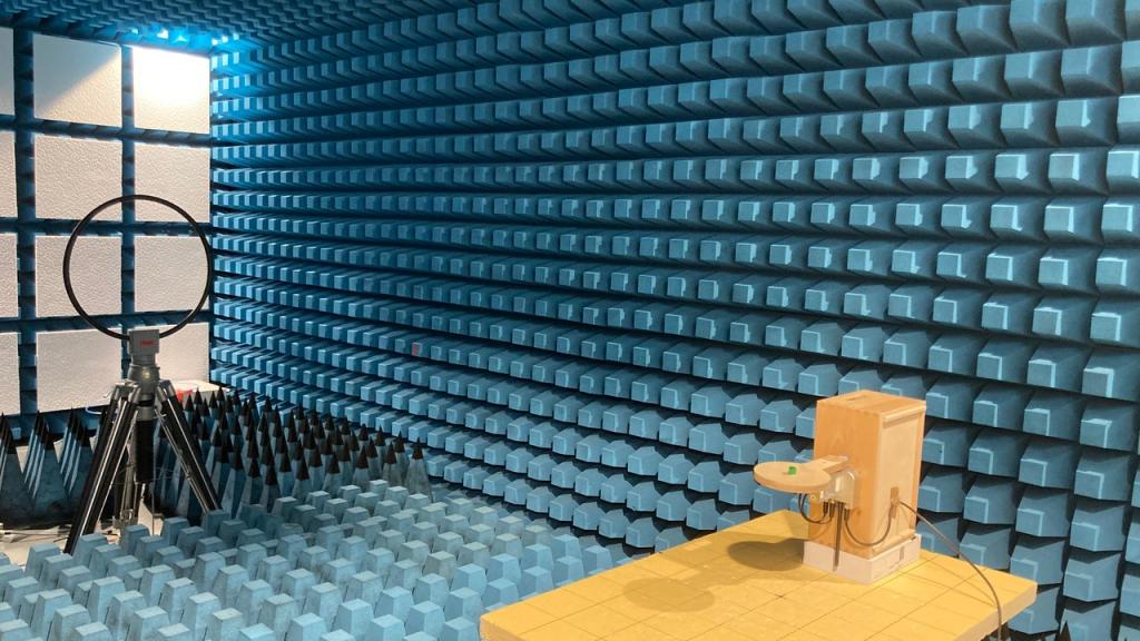 Then the actual measurements started in our partner lab’s anechoic chamber – this is a room that is completely shielded from any radio signals in our environment (e.g. wireless LAN, mobile phones, etc…) and has its walls covered with non-reflective structures. The prototype and on it, an RFID bird ring, was then placed on a rotating turn table. Using the USB service port, we turned on the RFID reader in continuous wave (CW) mode, such that it transmits a constant 125 kHz signal. This signal was then picked up by a wide-band H-field antenna (which is just a very large circular coil), and, using a spectrum analyzer, the magnetic field strength could be plotted across the entire frequency range from 10 kHz to 30 MHz. This measurement was repeated for every possible orientation of the DUT, using the turntable, and also by placing it sideways.