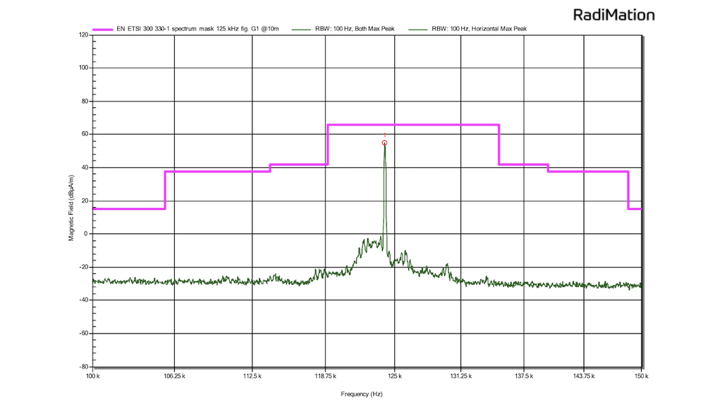 Let’s look at some of the results of these tests. In the figure below, the magnetic field strength of the RFID reader in active mode is plotted in green. A distinct peak is visible close to its intended frequency of operation: 125 kHz. The pink line is an envelope that describes the maximum allowed field strength of an LF RFID device according to the respective norm, which the DUT is respecting.